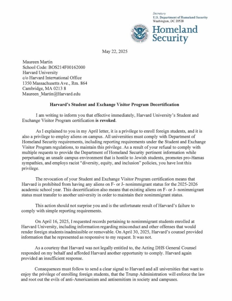 Un véritable tremblement de terre secoue le monde académique américain. L’université Harvard, symbole d’excellence et de prestige, s’est vu retirer le droit d’accueillir des étudiants étrangers par l’administration Trump. La décision, officialisée jeudi 22 mai 2025 par la Secrétaire à la Sécurité intérieure Kristi Noem, suscite une onde de choc dans les milieux universitaires et politiques.