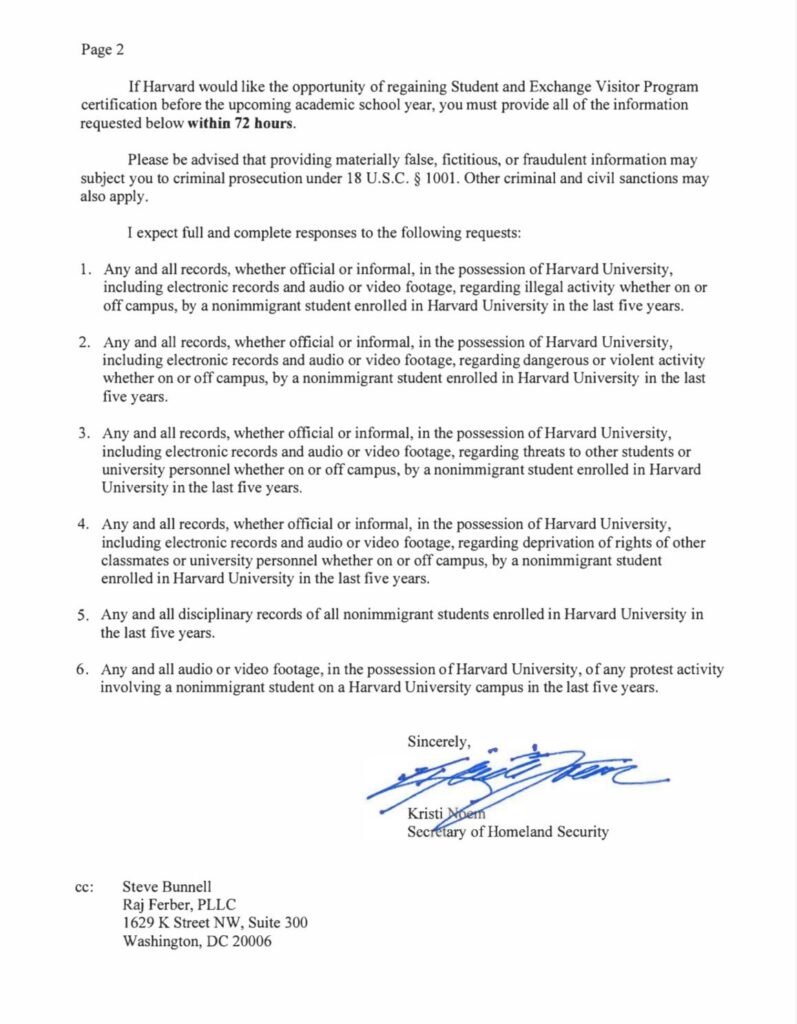 Dans une lettre adressée à l’établissement et publiée sur les réseaux sociaux, Kristi Noem affirme que cette mesure vise à lutter contre un « climat de violence et d’antisémitisme » qui se serait développé sur le campus de Cambridge, dans le Massachusetts. « La certification du programme d’accueil des étudiants internationaux de l’université Harvard est révoquée avec effet immédiat », peut-on y lire.