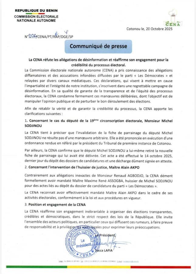 Face aux accusations de partialité reléguées dans les médias par le parti Les Démocrates, la CENA sort du silence. Dans un communiqué rendu public le 20 octobre 2025, l’institution électorale dénonce une campagne de désinformation et réaffirme son engagement à garantir la transparence du processus électoral.