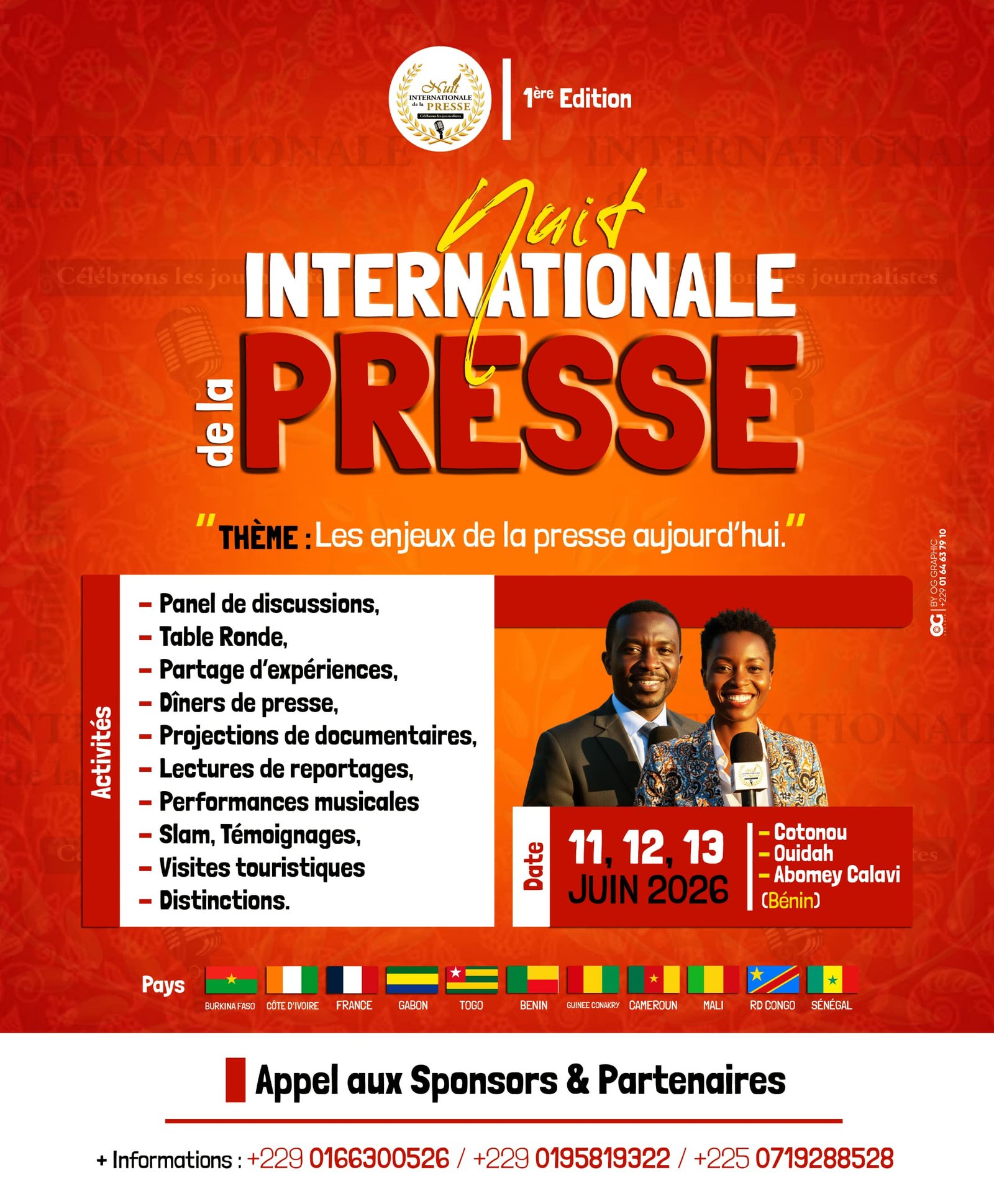Du 11 au 13 juin 2026, le Bénin se positionnera au cœur du débat médiatique international avec la 1ère édition de la Nuit Internationale de la Presse (NIP). Un événement inédit dédié au journalisme et à la communication, organisé autour du thème central : « Les enjeux de la presse aujourd’hui ».